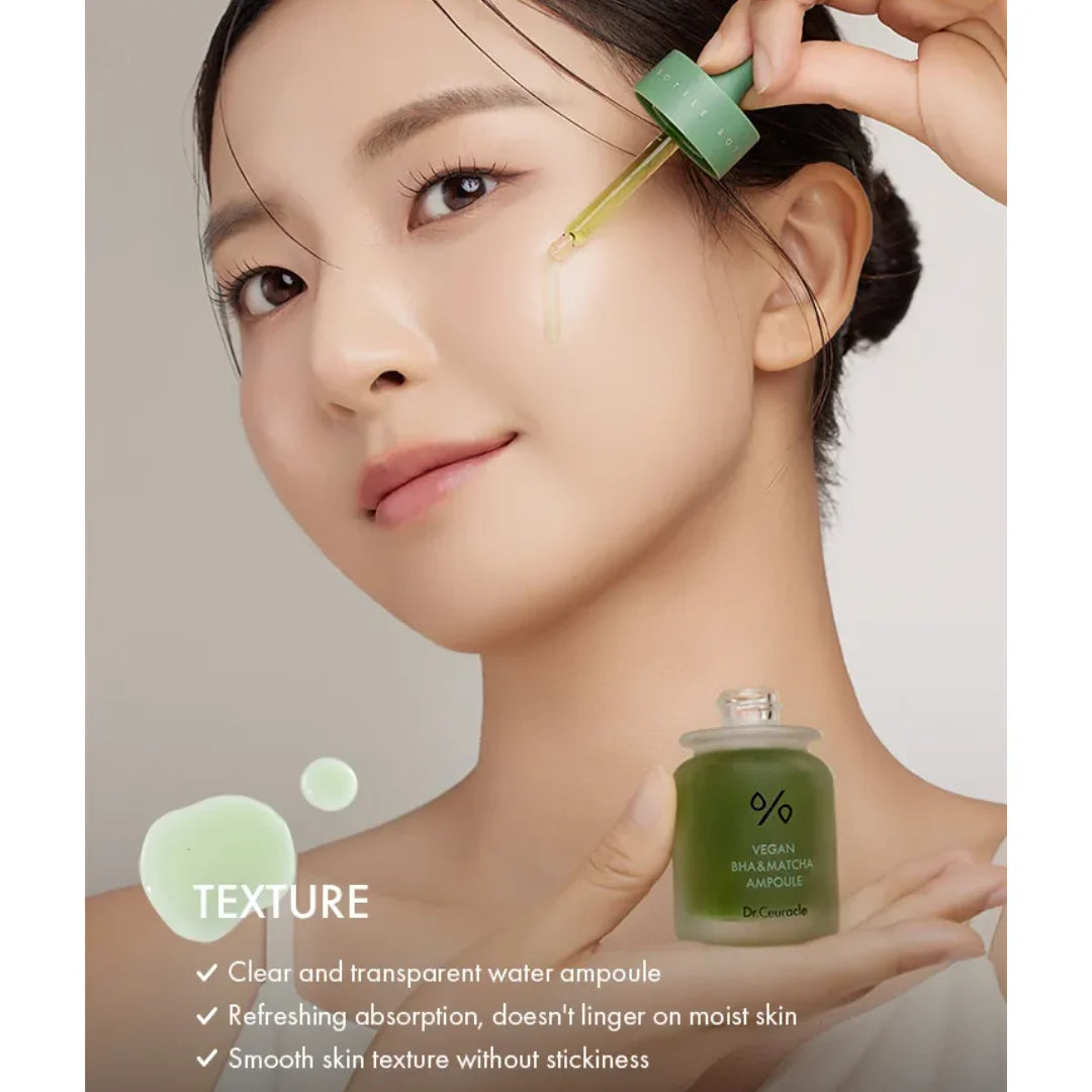 A combination of active and balancing ingredients that also calm and sooth irritated and troubled skin. Dr. Ceuracle Vegan BHA & Matcha Ampoule includes BHA (0.5%) to balance excess sebum, while a peptide complex reduces inflammation and strengthens elasticity and skin regeneration. Matcha extract, from Jeju Island, provides antioxidant-rich calming properties. Its lightweight, non-sticky texture absorbs easily and treats all skin types.