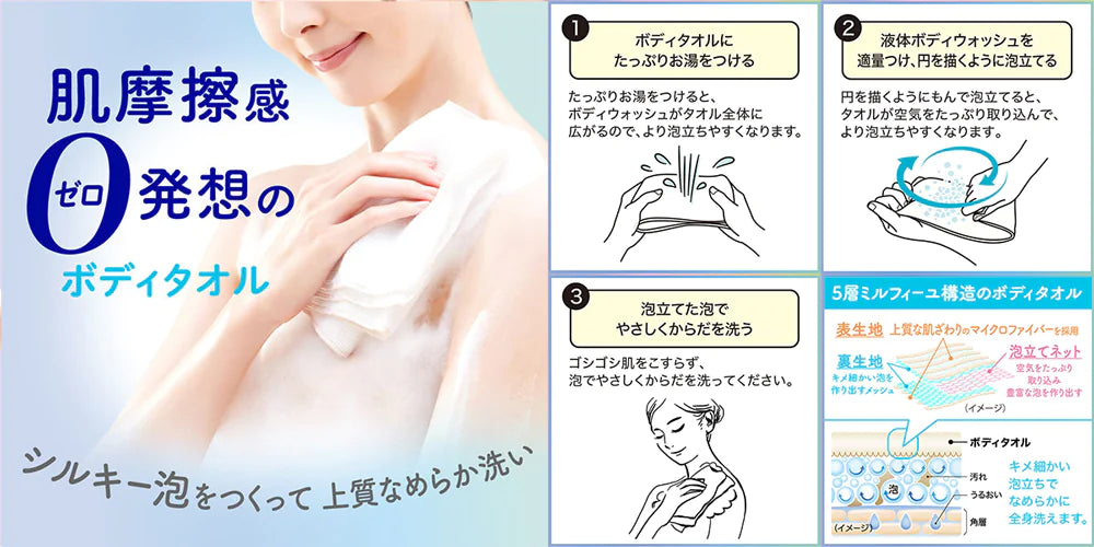 - A fine foam born from a 5 -layer millefeuille structure allows the skin to wash the whole body without rubbing the skin.