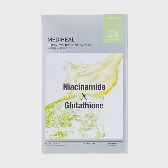 MEDIHEAL Derma Synergy Wrapping Mask Niacinamide x Glutathione (4pcs) is an intensive brightening sheet mask designed to even skin tone, reduce dullness, and enhance radiance. Enriched with niacinamide and glutathione, it helps fade dark spots, improve clarity, and deliver deep hydration. Each mask wraps the skin in a rich essence, leaving your complexion smooth, luminous, and revitalized.