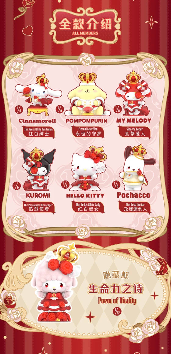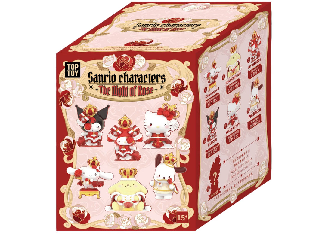 The Sanrio Characters The Night of Rose Blind Box adds a touch of romantic, gothic charm to your collection with beautifully detailed figures featuring your favourite Sanrio friends dressed in dreamy rose-themed outfits. Each mystery box reveals a unique character with elegant colours and delicate accents, making it a stunning pick for fans who love collectible art toys with a soft, magical night-rose aesthetic.