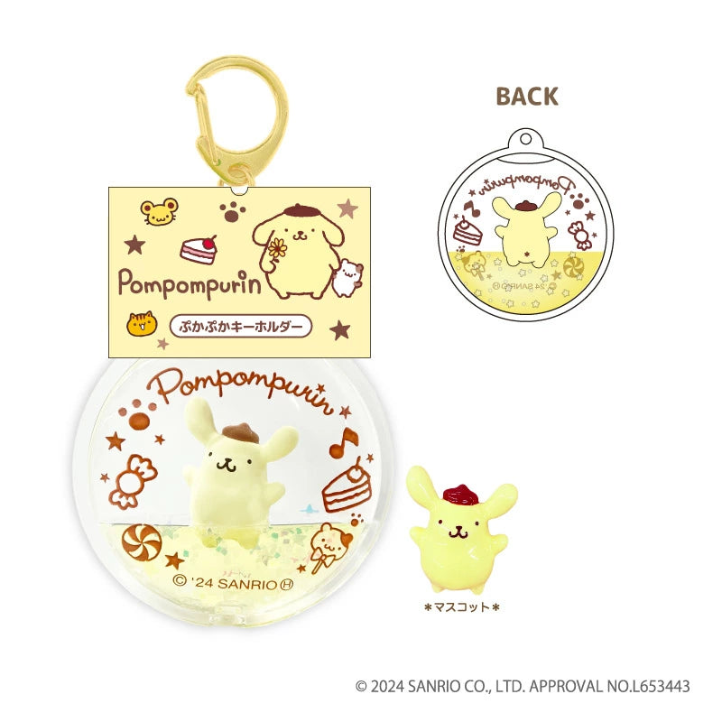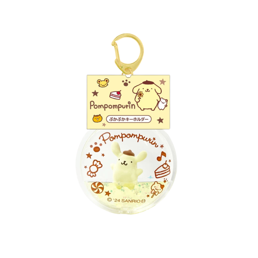 An adorable Pompompurin floating key holder with sparkling sequins inside, perfect for fans of the lovable character.