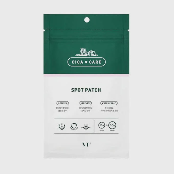 VT Cosmetics Cica Spot Patches. Infused with soothing Centella Asiatica, these hydrocolloid patches absorb impurities, prevent external contamination, and promote rapid healing. The waterproof, ultra-thin, and transparent design offers discreet coverage for daily wear, coming in two sizes (10mm and 12mm) to target different spot sizes. Ideal for acne-prone skin, these patches help reduce inflammation and prevent scarring for clearer, healthier skin.